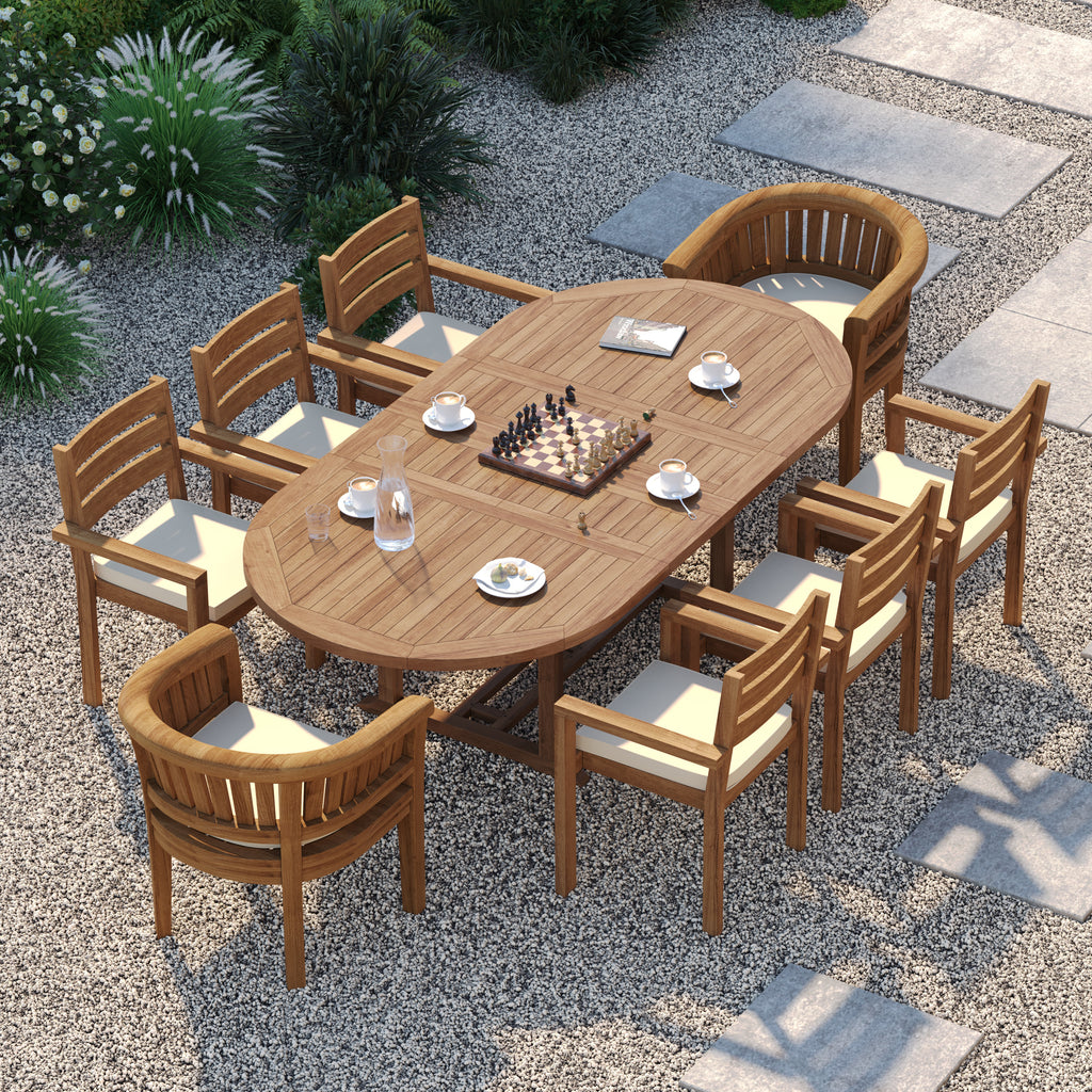 Complete Teak Dining Set: Includes one 180–240cm Oval Extending Table, six Marlow Stacking Chairs and two San Francisco Chairs for outdoor dining.