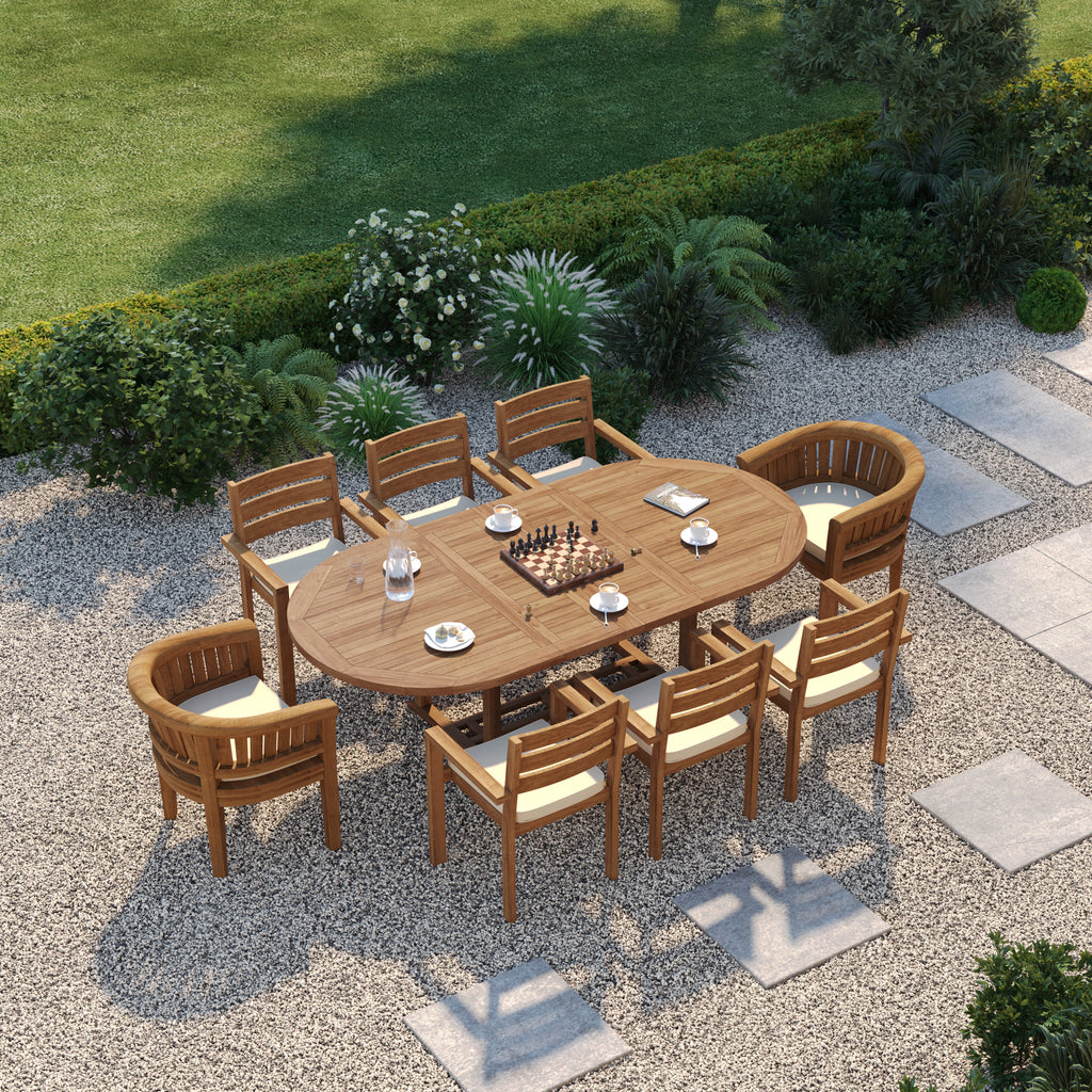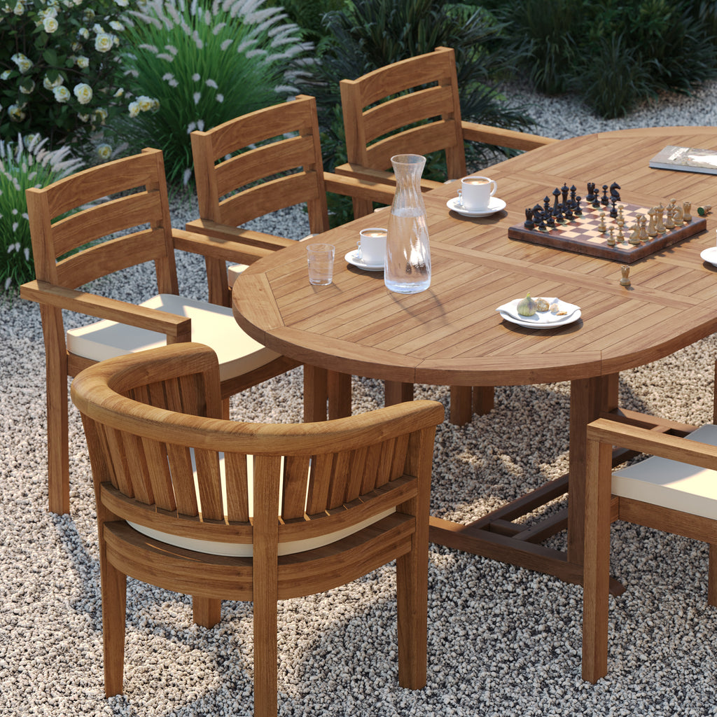 This teak outdoor dining set offers a refined and versatile solution for stylish outdoor dining. Crafted from natural teak, it centres on an elegantly shaped Oval Extending Table that creates a welcoming focal point for any garden or patio.