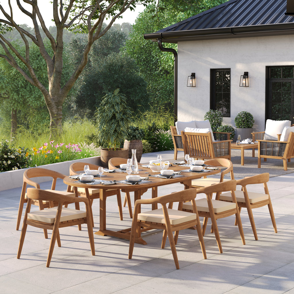 Complete Teak Dining Set: Includes one Oval Extending Table and eight Sydney Chairs for a well-balanced outdoor dining layout.