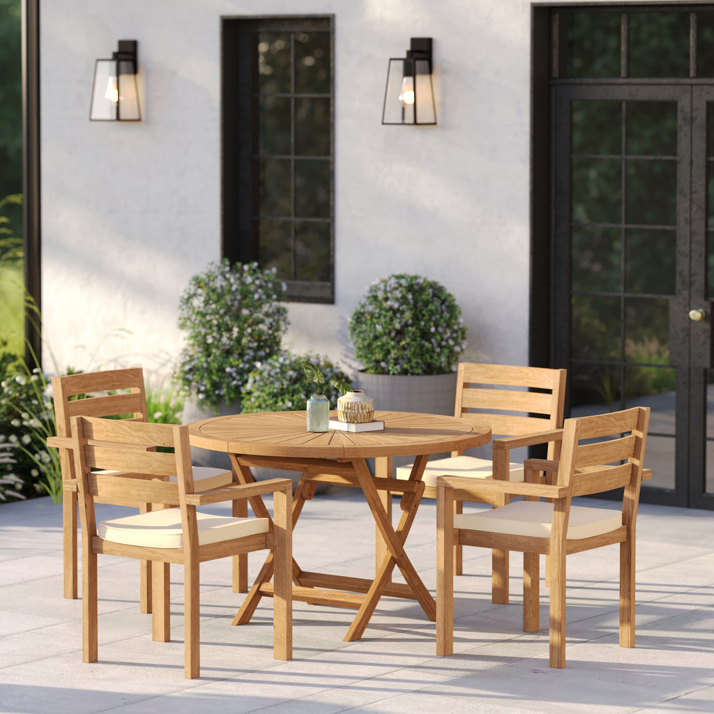 Compact Teak Dining Set: Includes one 120cm Sunshine Folding Table and four Marlow Stacking Chairs for a cohesive outdoor dining arrangement.