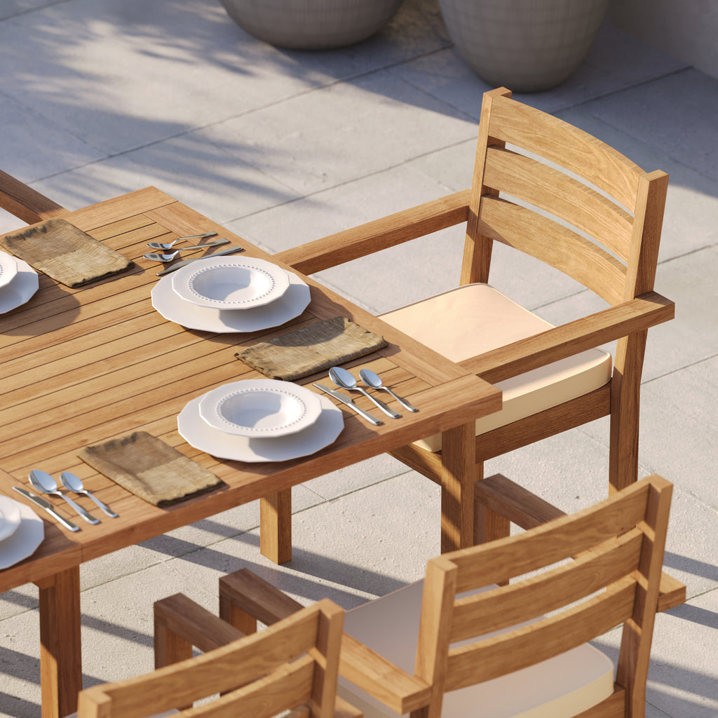 Create an inviting centrepiece for outdoor entertaining with this generous teak dining set, designed to bring warmth, balance and comfort to your garden. The Rectangle Extending Table is crafted from solid, natural teak with a substantial 4cm top, combining enduring strength with smooth lines and rich tones that transition effortlessly from everyday dining to special gatherings.