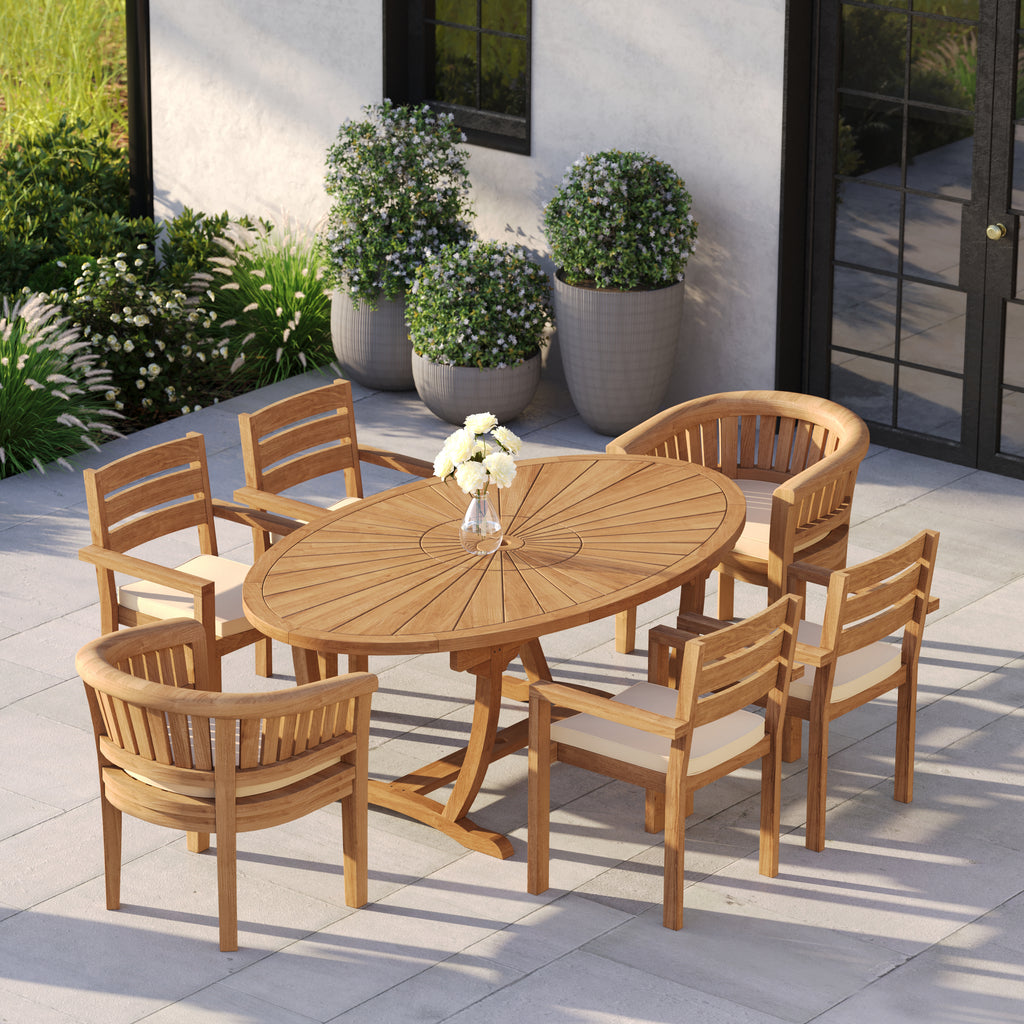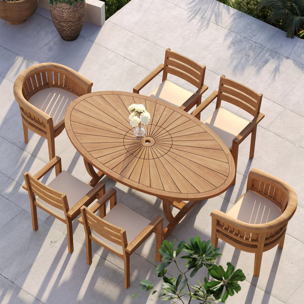 This teak dining set creates a generous, sociable outdoor arrangement ideal for relaxed gatherings. Crafted from natural teak, the set centres on a 2m Sunshine Oval Table featuring a distinctive radial slatted tabletop that naturally draws the eye and encourages conversation.